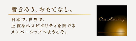 One Harmonyは、オークラホテルズリゾーツ、ニッコー・ホテルズ・インターナショナル、ホテルJALシティでご利用いただける入会金・年会費無料の会員プログラムです。