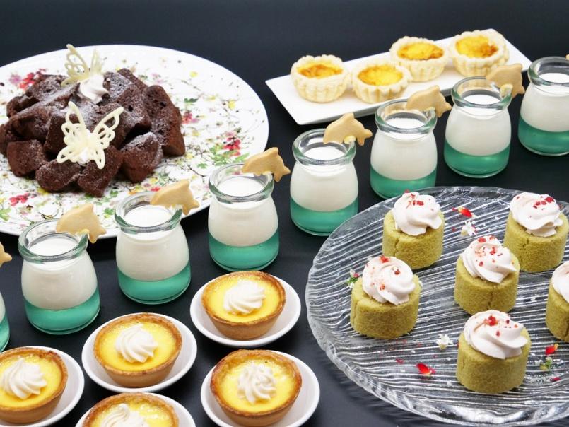 A:デザートスペシャルは毎週金曜日に追加されます。今回のリニューアルメニューのイチ押しは「アリビラ海ゼリー」と「アリビラプリンタルト」です。「アリビラ海ゼリー」は、小さな瓶にレモン風味の青色のゼリーと、白い砂浜をイメージしたチーズフロマージュ、そして生クリームを3層にして入れることで、ニライビーチの美しい情景を表現しました。イルカのクッキーを添えることで、お子様にも楽しんで召し上がっていただけると思います。「アリビラプリンタルト」は、ラウンジで人気の「アリビラプリン」をハナハナランチブッフェでも提供し、幅広いお客様に召し上がっていただきたいという思いから製作しました。「アリビラプリン」のままだとやわらかすぎて食べづらくなってしまうので、レシピはそのまま、でもランチブッフェ用に焼き時間と温度を微調整して、しっかりした形を保ちつつ、中はとろりとした食感を残すように仕上げています。上に乗せたキャラメル風味のクリームと一緒に召し上がっていただくと、プリンの味が再現できますよ。