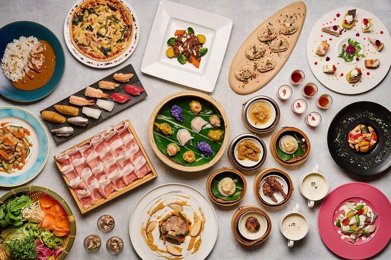 小籠包や海老餃子など10種の本格「飲茶」をはじめ、旨味たっぷりの「あぐー豚と野菜しゃぶしゃぶ」、贅沢な「握り寿司」、種類豊富な洋食など、和・洋・中のメニューを取り揃えました。洋食は、軽やかな味わいの「シーフードマリネ アセロラ風味」や旨みたっぷりの「チキンソテー 赤ワインの香り」、爽やかな「キャベツと人参のクミン風味」などをご賞味いただけます。「アップルクランブルケーキ」や「イチゴとミルクのゼリー」など、デザートも多数ご用意いたしました。