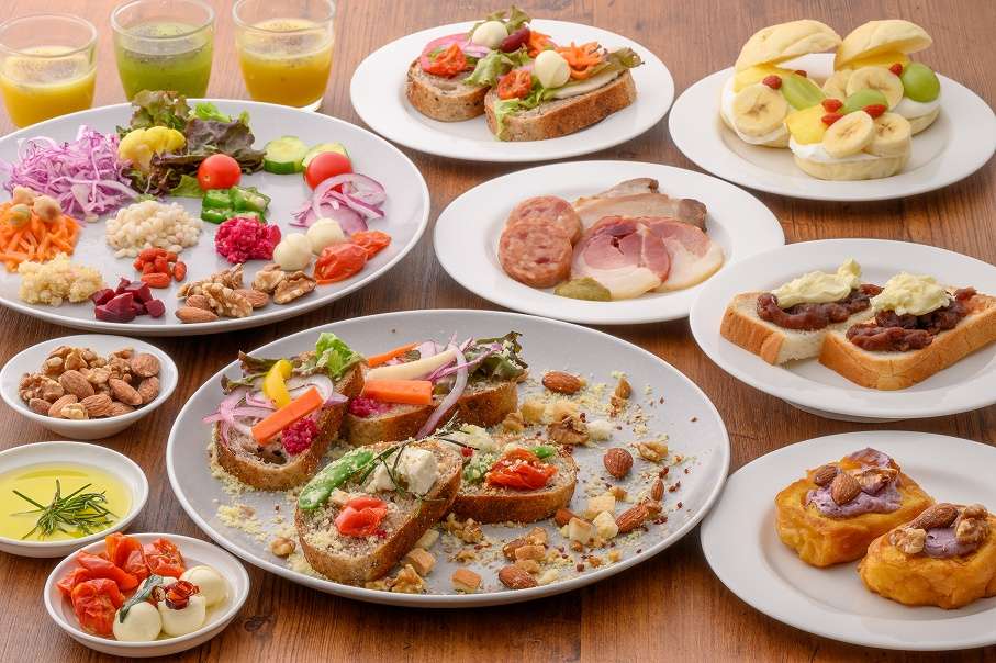 ベルデマールの朝食は、お好みのメニューやシェフズコーナーの洋食料理をブッフェスタイルでお楽しみいただけます。人気の紅芋ジャムやパインバター、あずき餡など 8 種のトッピングやソースで召し上がっていただく焼きたてのフレンチトーストをご堪能ください。また、ゴーヤーや沖縄産南瓜と人参などを使用したスムージー、沖縄県産豚を使用したソーセージ、美ら島あぐーハム、沖縄産発酵さとうきびバガスと雑穀のリゾット、オムレツコーナーでは青パパイヤ入りオムレツ ココナッツミルク風味やゴーヤー入りポーク玉子丼など60 種以上をご用意しています。 そのほか、料理と相性のよいシークヮーサー胡椒や島唐辛子オイルなど沖縄ならではの調味料、ローズマリーオイルやバジルペースト、チアシードやキヌアなどもお料理とご一緒にお楽しみください。
