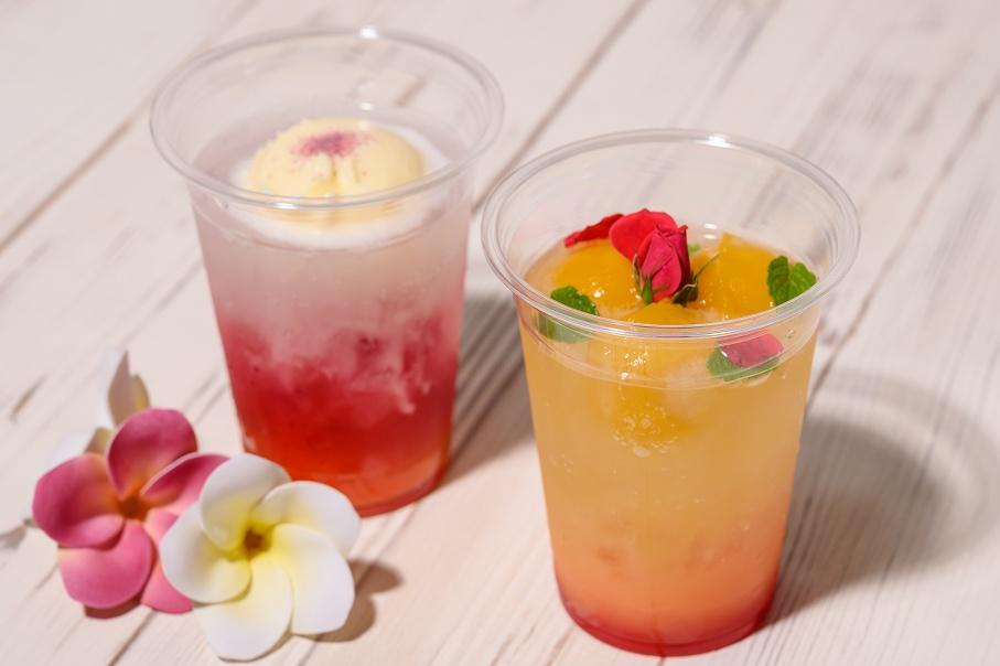 ■ハイビスカスアイスボールフロート ピーチ風味のソーダにハイビスカスローズのハーブティーを球体にした氷をトッピングしました。バニラアイスの甘みにプラスしてハイビスカス塩の塩味がアクセントとなった目にも楽しいドリンクです。 ■トロピカルアイスボール マンゴーの濃厚な甘さをアイスボールに仕立てた一杯。シークヮーサーの爽やかな風味と絶妙にマッチします。シュワッとしたソーダで喉越しすっきり。太陽の下で飲みたいトロピカルな美味しさです。